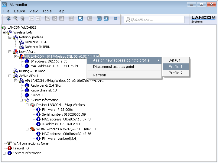 In LANmonitor, click on the new AP with the right-hand mouse key. From the context menu that pops up, you select the configuration which is to be assigned to the device.
