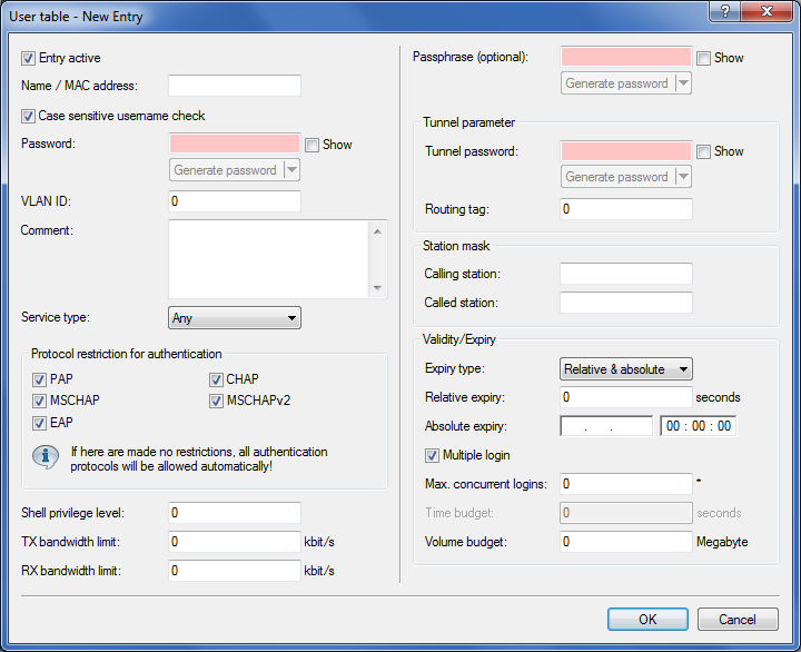 In LANconfig enter the approved MAC addresses into the RADIUS database in the configuration section on the General tab. Enter the MAC address as Name and as Password and select the authentication method All.