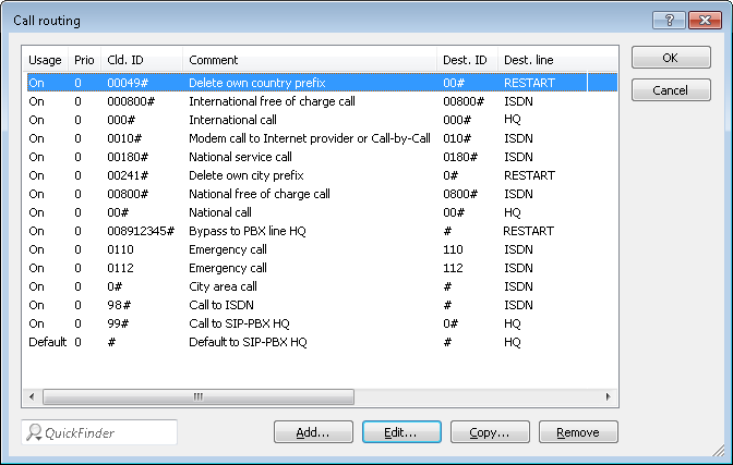 - The call routing table suggested by the setup wizard automatically allows international and national long distance calls to be made via the SIP PBX at the headquarters.In addition, a default route is used to direct calls from the LANCOM VoIP users to internal SIP PBX numbers via the corresponding SIP PBX line.