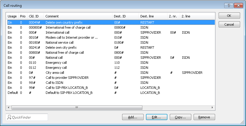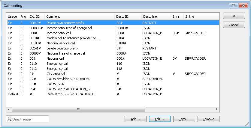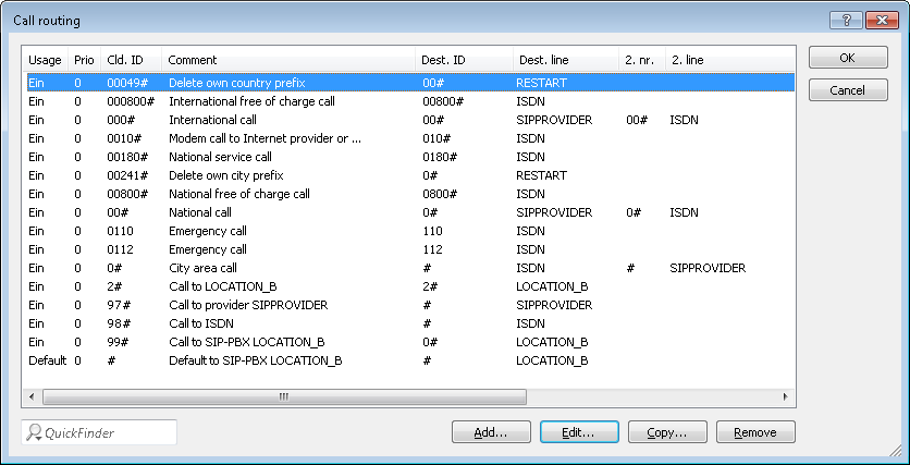 - Adapt the suggested call routing table in order to make international and national long distance calls via the SIP provider line with backup over ISDN. When doing so, please observe that the 0 preceding the number needs to be removed.After adaptation for international and national long distance calls, the call routing table appears as follows: