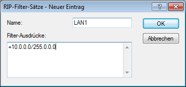 Routes learned from RIP can be filtered by their routing tag according to the settings for LAN and WAN RIP. Routes can additionally be filtered by specifying network addresses (e.g. "Only learn routes in the network 192.168.0.0/255.255.0.0"). First of all a central table is used to define the filters that can then be used by entries in the LAN and WAN RIP table.