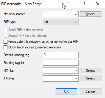 In most cases, it is not desirable for the local network structure to be propagated to the DMZ via RIP. Furthermore it is sometimes desirable to propagate routes to a network, but not to learn routes from that network (e.g. in the WAN). For this reason, the RIP function can be configured separately for each network.