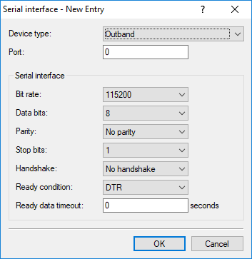 The ready condition is an important property of any serial port. The COM port server transmits no data between the serial port and the network if the status is not "ready". Apart from that, in the client mode the act of switching between the "ready" and "not-ready" states is used to establish and terminate TCP connections. The readiness of the port can be checked in two different ways. In DTR mode (default) only the DTR handshake is monitored. The serial interface is considered to be ready for as long as the DTR line is active. In data mode, the serial interface is considered to be active for as long as it receives data. If no data is received during the timeout period, the port reverts to its "not ready" status.