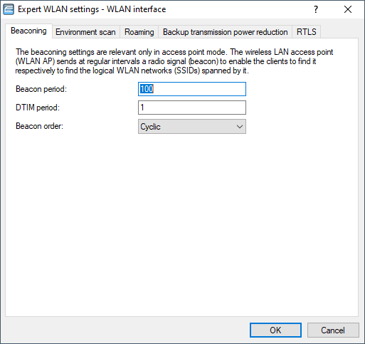 Settings in the beaconing table influence the transmission of beacons by the access point in AP mode. In part this can influence the roaming behavior of clients, and in part this serves to optimize the MultiSSID mode for older WLAN clients.