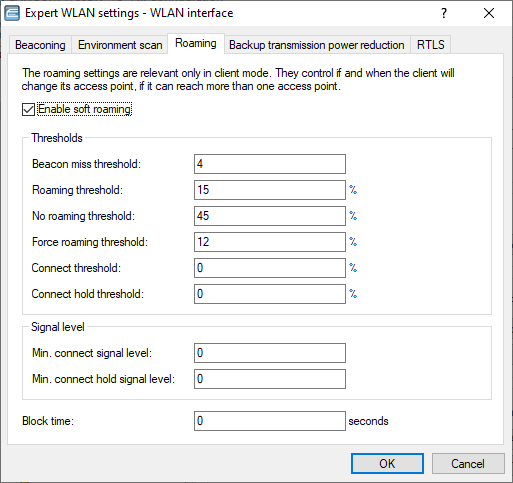 - With this option enabled, a client uses scan information to roam to a stronger AP (soft roaming). Roaming due to connection loss (hard roaming) is unaffected by this. The roaming threshold values only take effect when soft roaming is activated.