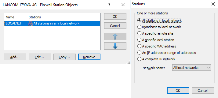 This is where the stations are defined that the firewall rules are to use as packet sender or addressee. The station objects are not restricted to any particular source or destination, but can be used as required by the firewall rules. In conjunction with ARF, for example, it is possible to define a specific IP network as a station object.