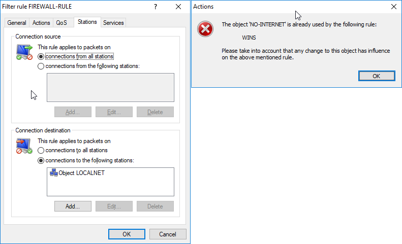 When editing an existing firewall rule, the user is shown whether actions, QoS, stations or services have been added as pre-defined objects. A message is displayed if you try to edit a referenced object that is already used by another firewall.