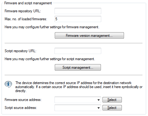 The configuration of firmware and script management provides precise control over the distribution of the files. It is possible, for example, to limit certain firmware versions to certain device types or MAC addresses.