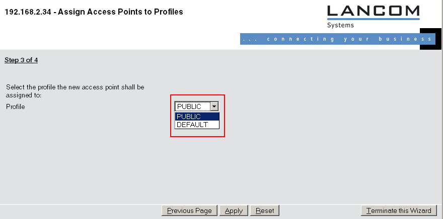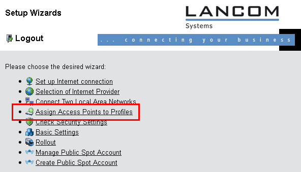 Click on the link to start the wizard. Select the desired AP by means of its MAC address and choose the WLAN configuration that is to be assigned to it.