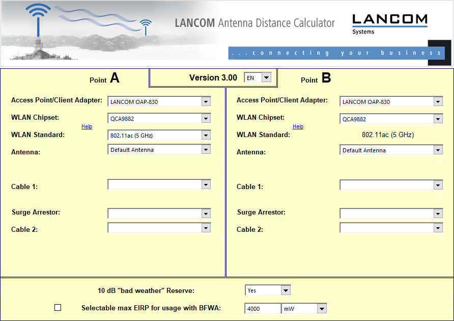 The LANCOM Antenna Distance Calculator is a program that you can use for calculating the output power at the AP and to make a first estimate of the achievable ranges and data rates.