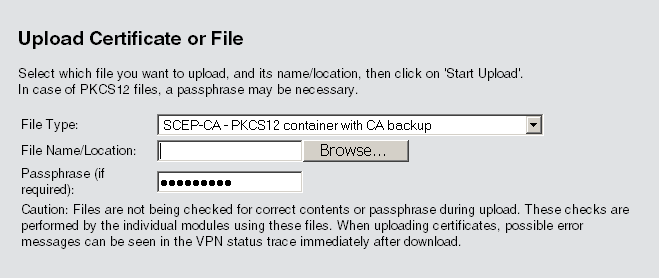 For each upload, enter the file name, storage location, and the passphrase that was defined when the backup file was created.