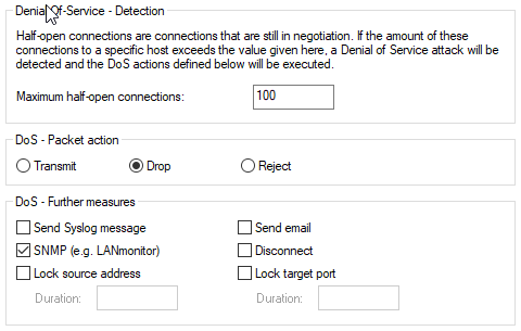 Your device detects most of these attacks and reacts with appropriate countermeasures. Detecting these attacks relies on counting the number of connections which are concurrently under negotiation (half-open connections). If the number of half-open connections exceeds a certain threshold value, then the device assumes that a DoS attack is underway. The actions and measures which are taken in this case can be defined, similar to firewall rules.