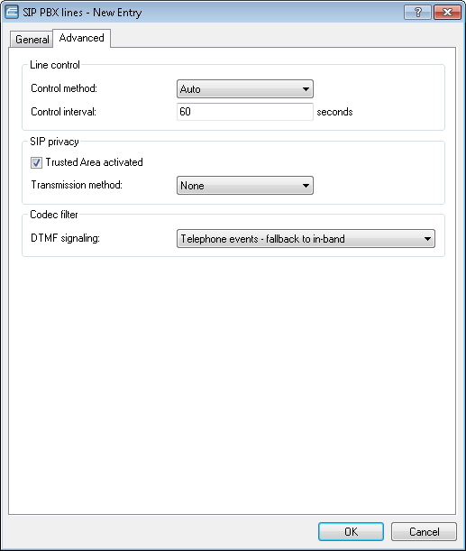 On the tab Advanced you configure the line monitoring, as well as the calling line identification restriction.
