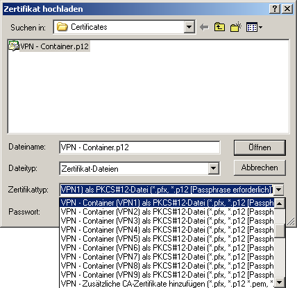 In order to support multiple certificate hierarchies, up to nine PKCS#12 files can be uploaded to the device. Also, further files with individual additional CA certificates can be uploaded, which enclose the certificates either individually or as PKCS#12 containers. All certificate hierarchies can be managed manually or with SCEP, and they can use CRLs.