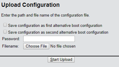 The customer-specific standard settings or the rollout configuration can be uploaded to the device with WEBconfig under Extras > File management > Upload configuration: Here you select the configuration file to be used and you activate the purpose as either customer-specific standard settings (first memory space) and/or rollout configuration. Alternative boot configurations must be available as *.lcf files.