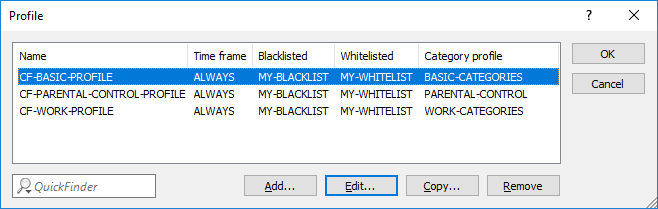 - There are three category profiles: BASIC-CATEGORIES, WORK-CATEGORIES and PARENTAL-CONTROL. The category profile specifies the categories which are to be allowed and forbidden, and for which one an override can be activated.