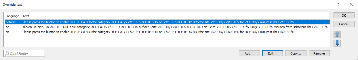 Important: The country code must match the browser language setting exactly, e.g. "de-DE" must be entered for German ("de" on its own is insufficient). If the country code set in the browser is not found in this table, or if the text stored under that country code is deleted, the predefined default text ("default") will be used. You can modify the default text.Possible values:- 10 alphanumerical characters