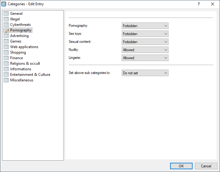 - For each main category and the associated sub-categories, it is possible to define whether the URLs are to be allowed, forbidden or allowed with override only.