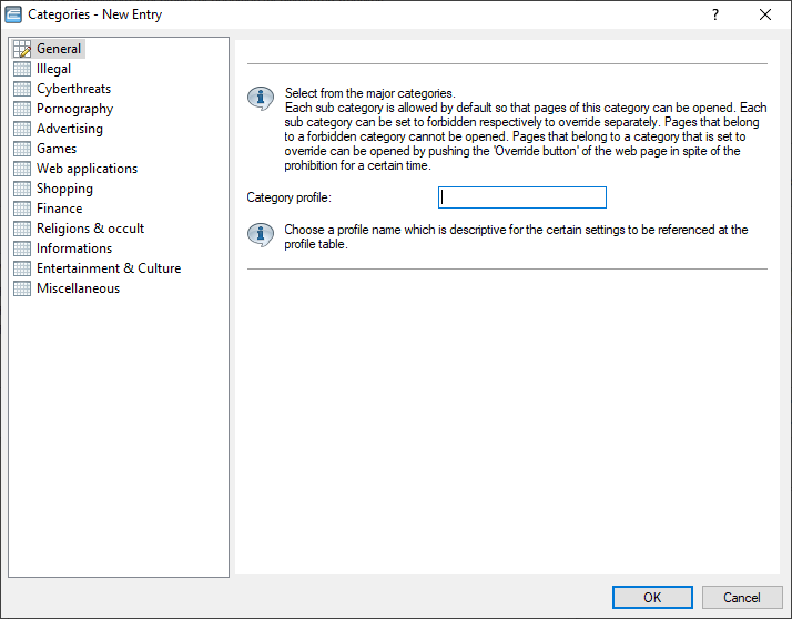Here you create a category profile and determine which categories or groups should be used to rate web sites for each category profile. You can allow or forbid the individual categories or activate the override function for each group.
