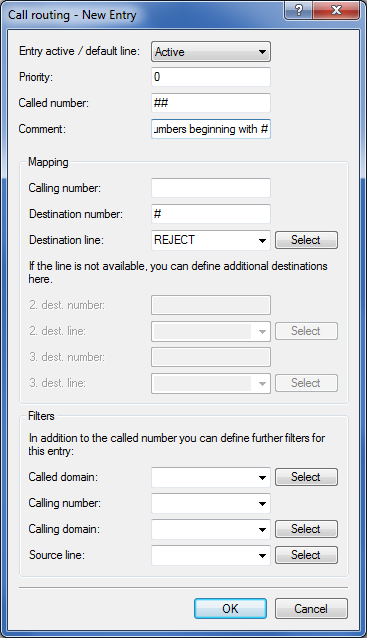 This prevents the dialing of control characters. Control codes can, for example, be used to configure call forwarding. You can prevent this for any particular lines or persons. For example, proceed as follows to reject the character '#':
