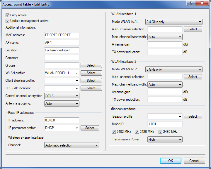 Do this by entering each access point with its MAC address into the access point table. Alternatively you can use the Default button to create a default profile, which applies to all access points.