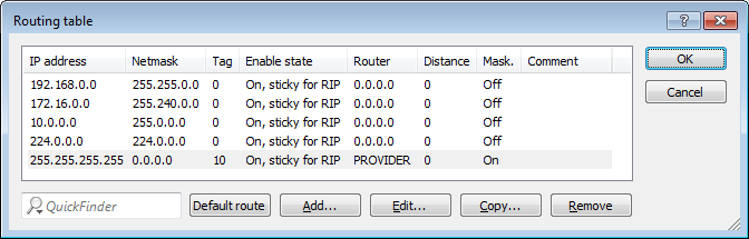 In order for this access to be available to users of the guest network only, set the routing tag "10" for the corresponding route. This ensures that only data packets from the IP network "GUEST" with the interface tag "10" are transmitted to the provider's network. The different routing tag values ensure that data cannot be routed between the guest network and the internal network.
