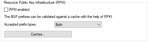 RPKI can be found in LANconfig under Routing protocols > General > Resource Public Key Infrastructure (RPKI). With the help of RPKI, BGP prefixes can be validated against a cache. To do this, the Matches table of the BGP policy provides an option for selecting the RPKI state of the relevant prefix. See Matches.