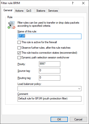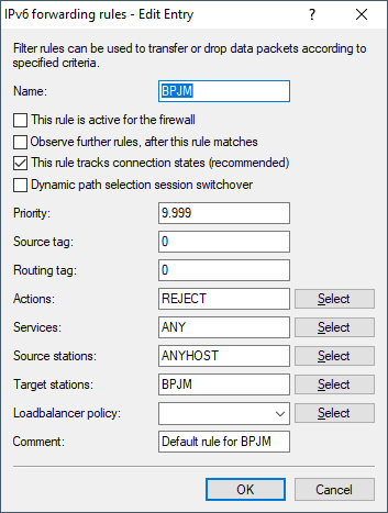 The IPv6 firewall features a new default rule BPJM, which is deactivated by default with the system object "BPJM" as the destination station. A similar rule is available in the IPv4 firewall. The networks to be protected by the BPjM module are specified as source stations.