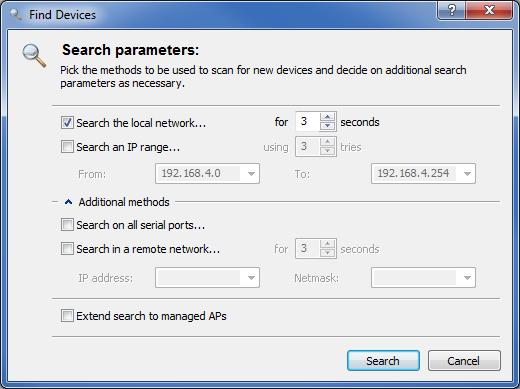 ) button or by calling the menu command . LANconfig then asks where it should search. To make further adjustments to the search, click on and then select the menu item Startup.