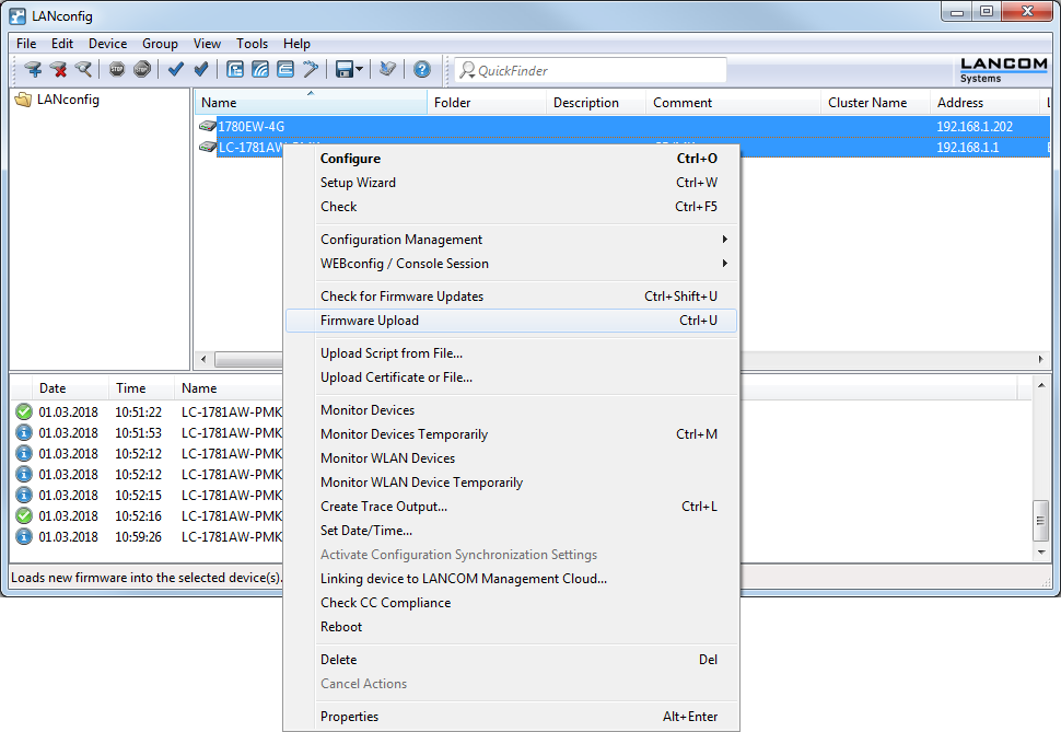LANconfig will then carry out the actions for all of the selected devices, one after the other. For example, you can upload new firmware simultaneously for multiple devices in this way.