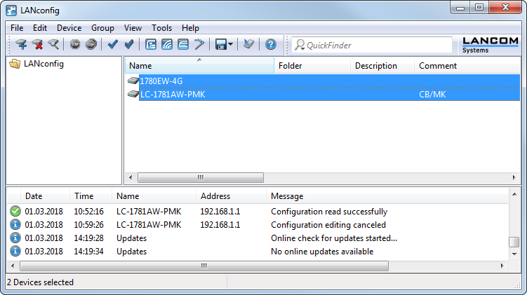LANconfig offers a convenient way of (remote) servicing multiple devices simultaneously. There are various ways of selecting multiple devices at once:
