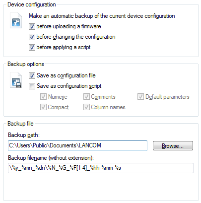 You can select what type of action is to be preceded by an automatic backup of the current device configuration. To activate the automatic backup, you have to have selected at least one of the following settings: