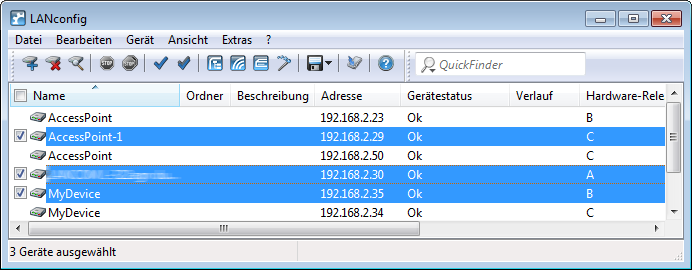This menu item is used to enable the display of check boxes. A check box is then displayed next to each device entry, which enables you to select the device. This gives you the option of selecting multiple devices for carrying out targeted actions (e.g. uploading new firmware) without the need of keyboard shortcuts.
