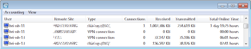 You can view the accounting information for a certain device. The accounting information is a protocol of the connections from each station in the LAN to remote sites in the WAN. Detailed information is recorded: