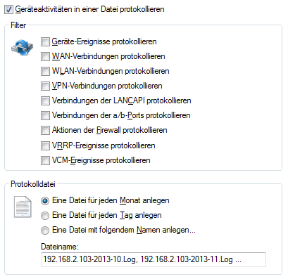 This page gives you control over how LANmonitor logs the device activities. Your selections under Filter determine which activities LANmonitor records and which log file to write.