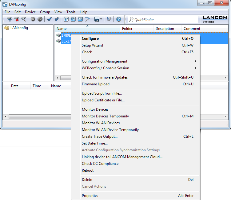 LANconfig facilitates the configuration of various devices within a project with a range of functions that can be run on several devices at once. If the list in LANconfig contains multiple devices, just click on the device of your choice with the right mouse key to open a context menu offering the following actions: