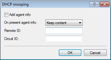 - Replace content: In this setting, the DHCP relay agent replaces any existing "relay agent info" with the values specified in the fields Remote ID and Circuit ID.