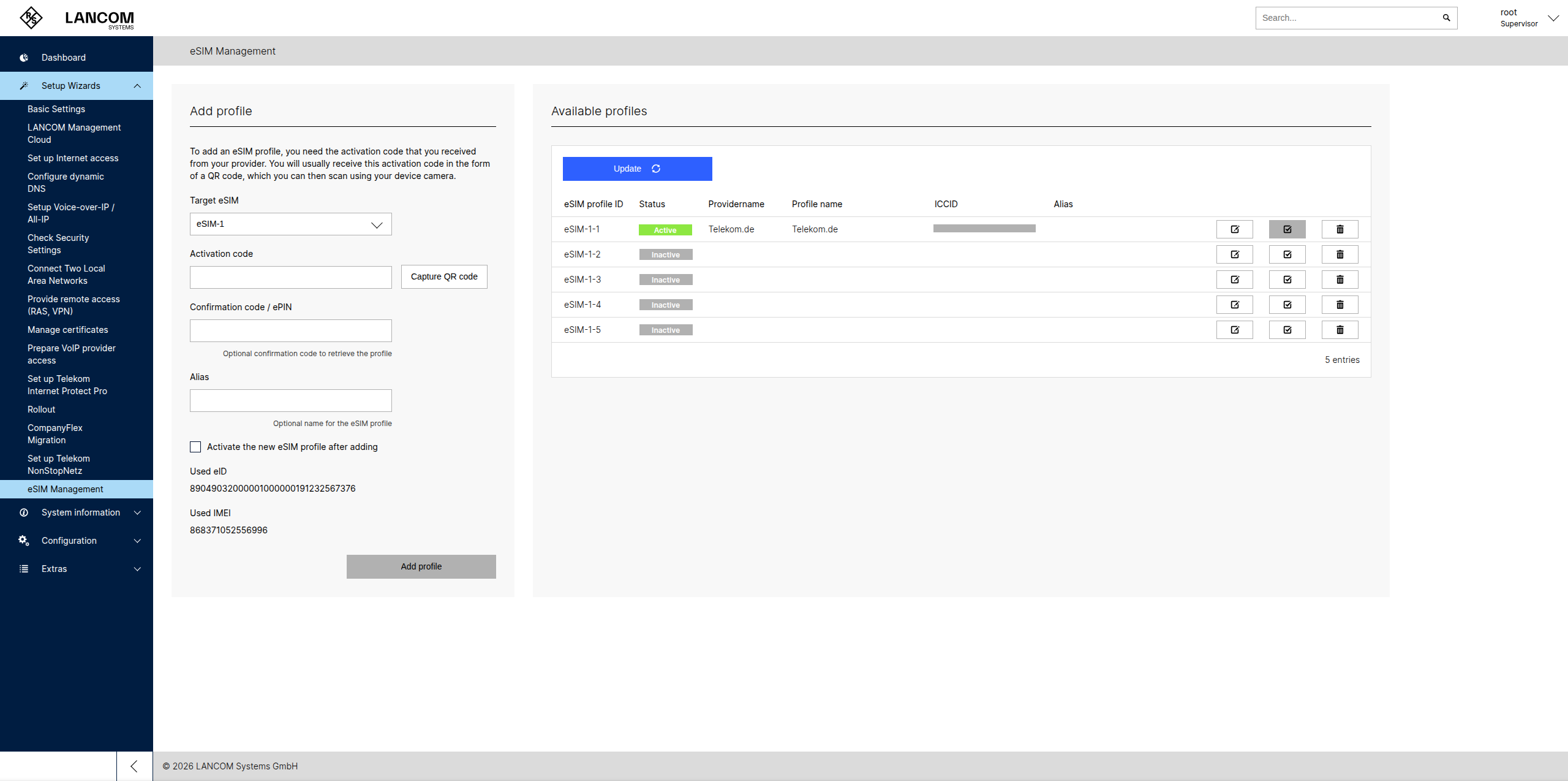 This area displays the eSIM profiles stored on the local device. In principle, only one eSIM profile out of a maximum of eight profiles can be active at any one time. The active profile can be used as "eSIM-1" in the SIM selection of the WWAN profile configuration. The three icons on the right-hand side allow the actions "Edit profile", "Activate profile", and "Delete profile".