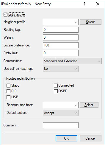Note: If no option is selected, the device does not redistribute any routes to the BGP neighbors of this neighbor profile (default setting). - Redistribution filter