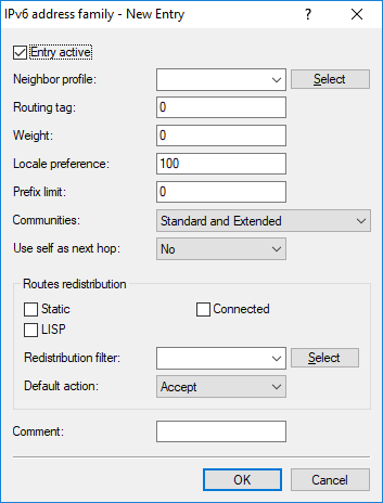- Enables or disables the distribution of IPv6 NLRI of this address family to the BGP neighbors that use this neighbor profile.