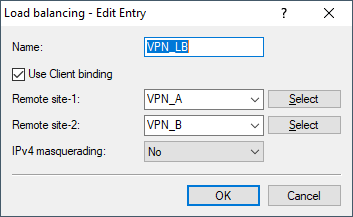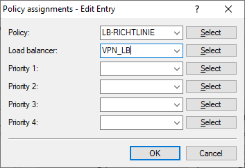 In the following, the newly created policy is linked to the VPN load balancer cluster VPN_LB. The priority fields can be left blank.