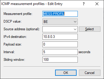 The first step is to create a new measurement profile. The IPv4 destination is the private IP address of the central gateway, 10.8.0.3. Measurement packets used to evaluate the paths are sent over the VPN tunnels (SD-WAN overlays) every 5 seconds.