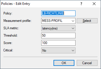 The next step is to create a new policy with an SLA metric "Latency" set with a threshold of 50 ms. If the corresponding VPN tunnel has a latency of less than 50 ms, the path is given a score of 100 (points). A connection that does not meet this criterion receives a score of 0, i.e. it is rated as worse. The path with the highest score is the preferred path and is therefore used for the data traffic. If both paths have an identical score of 100, load balancing is performed with both of the VPN tunnels.