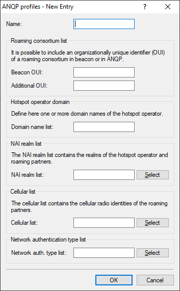 - Assign a name for the ANQP 2.0 profile here. This name will appear later in the interfaces table in the selection for ANQP profiles.