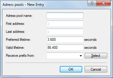 - With this parameter you can assign addresses to the network clients from the prefix that the router retrieved from the WAN interface via DHCPv6 prefix delegation. Select the desired WAN interface here. For example, if the provider assigned the prefix "2001:db8::/64", you can then set the parameter First address to the value "::1" in the Last address to "::9". In combination with the prefix "2001:db8::/64" as delegated by the provider, the clients receive addresses from the pool "2001:db8::1" to "2001:db8::9". If the provider prefix is greater than "/64", e.g.,"/48" or "/56", you must take subnetting for the logical network into account in the address.