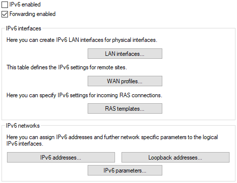 - Forwarding is used for packet forwarding between IPv6 interfaces. This option is activated by default.