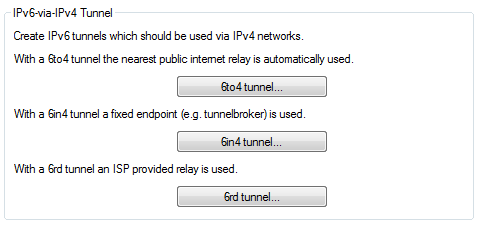 The Tunnel configuration offers you 3 buttons to create IPv6 tunnels that can be used over IPv4 networks. Use these options to gain access to the IPv6 Internet using an IPv4 connection.