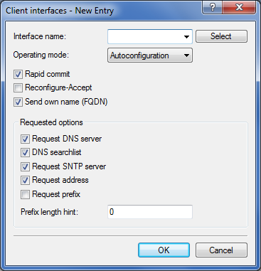- Name of the interface on which the DHCPv6 client is working. These can be LAN interfaces or WAN interfaces (remote sites), e.g. "INTRANET" or "INTERNET".