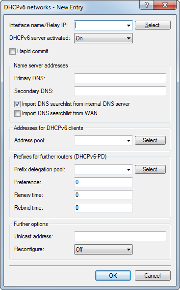 - Name of the interface on which the DHCPv6 server is working, for example "INTRANET". Alternatively, you can also enter the IPv6 address of the remote DHCPv6 relay agent.