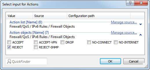 - Specifies the action that the firewall performs if the rule condition is true. Using Select you can choose one action or a list of actions.